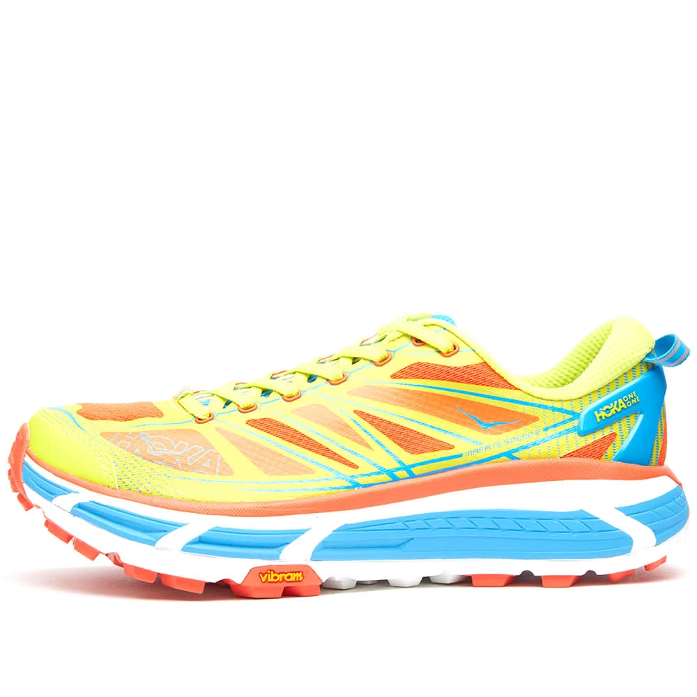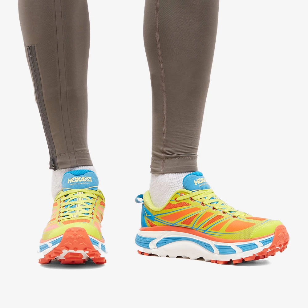 Supporting you on the toughest of terrains, the Mafate Speed 2 sneakers from HOKA ONE ONE won’t slow you down. You won’t go unnoticed either. Bright mesh uppers meet a Meta-Rocker midsole for optimum comfort and transition, while a treaded Vibram outsole grips onto the most uneven surfaces, so you can go that extra mile.